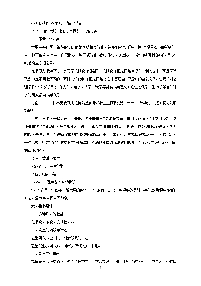 (2)通过学生讨论体会能量不会凭空消失,只会从一种形式转化为其他形式,或从一个物体转移到另一个物体。