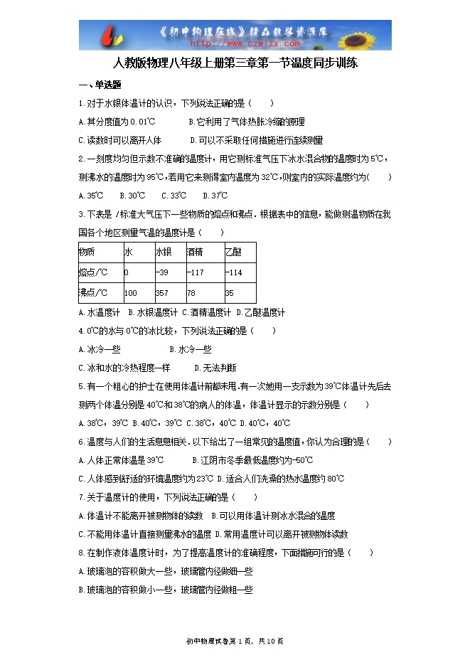 【内容简介】 一、单选题     1. 对于水银体温计的认识,下列说法正确的是(  )A.其分度值为0.01℃        B.它利用了气体热胀冷缩的原理C.读数时可以离开人体       D.可以不采取任何措施进行连续测量   2. 一刻度均匀但示数不准确的温度计,用它测标准气压下冰水混合物的温度时为5℃,测沸水的温度时为95℃,若用它来测得室内温度为32℃,则室内的实际温度约为(  )A.35℃    B.30℃    C.33℃    D.37℃   3. 下表是l标准大气压下一些物质的熔点和沸点.根据表中的信息,能做测温物质在我国各个地区测量气温的温度计是(  )      物质   水   水银   酒精   乙醚   熔点/℃   0   -39   -117   -114   沸点/℃   100   357   78   35   A. 水温度计  B.水银温度计 C.酒精温度计 D.乙醚温度计   4.0 ℃的水与0℃的冰比较,下列说法正确的是(  )A.冰冷一些            B.水冷一些C.冰和水的冷热程度一样      D.无法判断   5. 有一个粗心的护士在使用体温计前都未甩.有一次她用一支示数为39℃体温计先后去测两个体温分别是40℃和38℃的病人的体温,体温计显示的示数分别是(  )A.38℃,39℃ B.40℃,39℃ C.38℃,40℃ D.40℃,40℃   6. 温度与人们的生活息息相关.以下给出了一组常见的温度值,你认为合理的是(  )A.人体正常体温是39℃       B.江阴市冬季最低温度约为-50℃C.人体感到舒适的环境温度约为23℃ D.适合人们洗澡的热水温度约80℃   7. 关于温度计的使用,下列说法正确的是(  )A.体温计不能离开被测物体的读数  B.可以用体温计测冰水混合的温度C.不能用体温计直接测量沸水的温度 D.常用温度计可以离开被测物体读数   8. 在制作液体温度计时,为了提高温度计的准确程度,下面措施可行的是(  )A.玻璃泡的容积做大一些,玻璃管内径做细一些B.玻璃泡的容积做小一些,玻璃管内径做粗一些.............