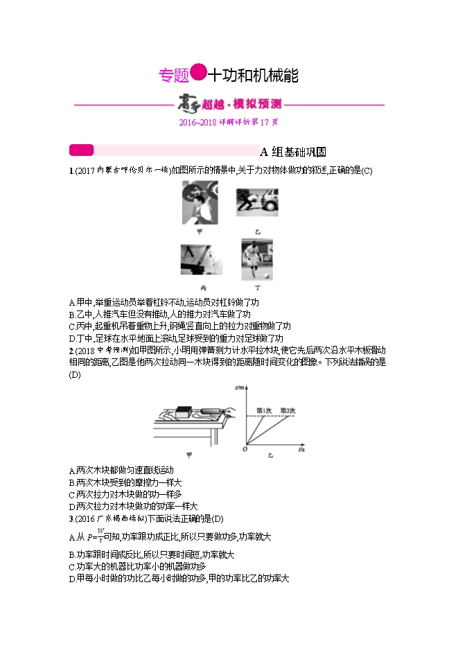 2018届中考物理总复习(课件 专题检测 模拟预测卷):专题十 功和机械能(3份打包)