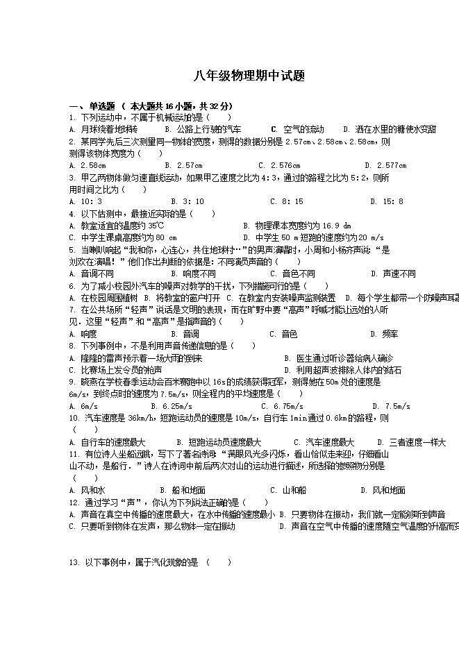 山东省宁津县育新中学2017-2018学年度第一学期期中考试八年级物理试题(无答案)