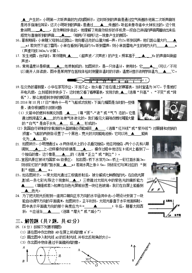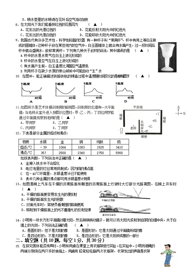 6.近年来,为了控制噪声污染,改善居民的生活环境,有些城市采取了城区禁止汽车鸣笛、道路两边种花植树、高架桥两侧安装隔声板等措施。下图所示的标志 中,表示“禁止鸣笛”的是 ( ▲ )