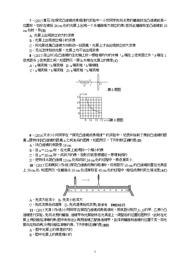 8.(2017凉山州)在凸透镜的主光轴上放一根粗细均匀的木棒,a端在2倍焦距之外,b端在1倍焦距与2倍焦距之间,如图所示,那么木棒在光屏上的像是(C)