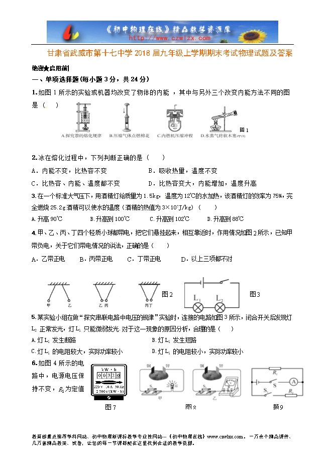 甘肃省武威市第十七中学2018届九年级上学期期末考试物理试题及答案