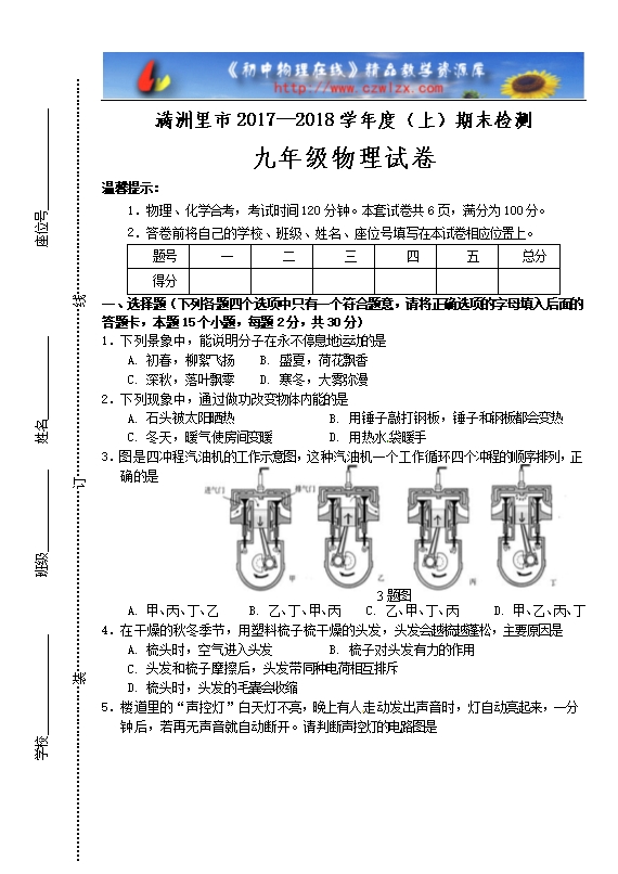 .物理、化学合考,考试时间120分钟。本套试卷共6页,满分为100分。
