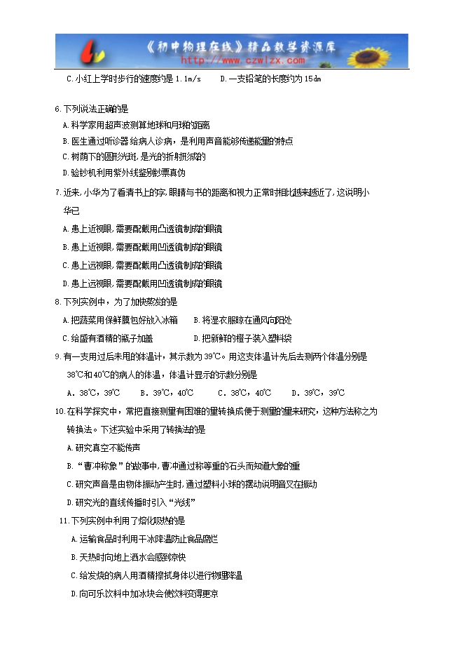 小红上学时步行的速度约是 1.1m /s D.一支铅笔的长度约为15dm