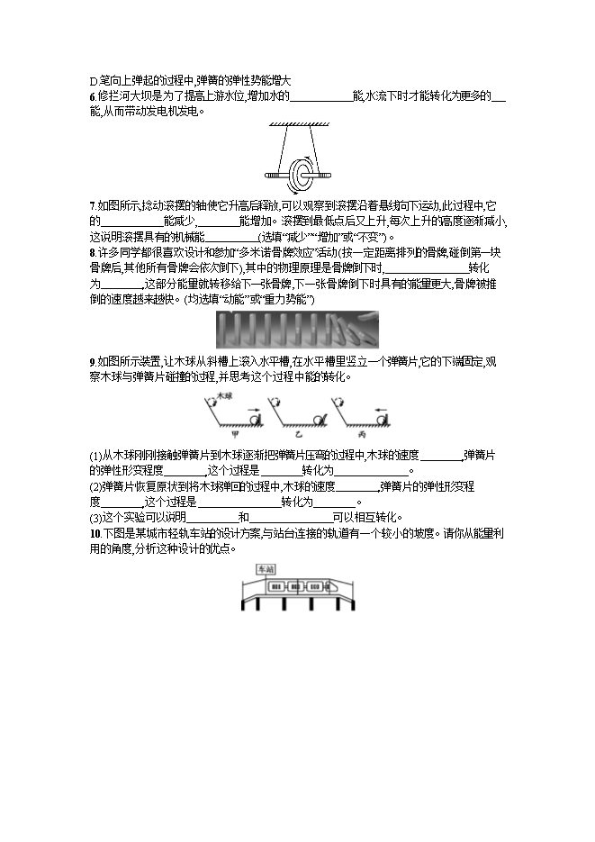 【内容简介】一、知能演练提升 1 .上紧发条的玩具车在水平桌面上由静止开始运动,运动所需的能量来源于(  ) A.动能                     B.电能 C.重力势能              D.弹性势能 2 .把篮球抛向空中,忽略空气阻力,如图所示中哪一图象能正确反映球离手后至落回地面前机械能(E)与篮球离地高度(h)的关系(  ) 3 .如图所示,“套圈”出手后,从A点到C点的过程中(不计空气阻力),下列说法正确的是(  ) A.“套圈”由A到B过程中,动能逐渐增大 B.“套圈”在B点的机械能大于在A点的机械能 C.“套圈”由B到C过程中,机械能逐渐变小 D.“套圈”由A到B再到C过程中,重力势能先变大后变小 4 .如图所示,小球从A处抛出时具有300 J的机械能,其中动能为100 J,小球经过B、C落到地面D处。B点是最高点,A、C在同一水平线上,不计空气阻力,则下列说法错误的是(  ) A.小球在C点的重力势能为200 J B.小球在B点的重力势能为300 J C.小球在D点处将触地时,动能为300 J D.小球在A、B、C三点机械能都是300 J 5 . 将一支内有弹簧的圆珠笔向下按压(如图),放手后笔会向上弹起一定高度。下列关于该过程中能量变化的叙述,其中正确的是(  ) A.向下按笔的过程中,弹簧的弹性势能减小 B.向下按笔的过程中,笔的重力势能增大 C.笔向上弹起的过程中,笔的重力势能增大