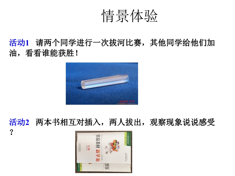 【内容简介】人教版八年级物理下册《8.3摩擦力》ppt课件+视频,共有17张幻灯片,以“拔河比赛”引入课题,以实验为主线,先让学生动手感受摩擦力的存在和方向,用实验探究滑动摩擦力与哪些因素有关,最后通过视频和图片来学习增大减小摩擦的方法,并进行相关练习。