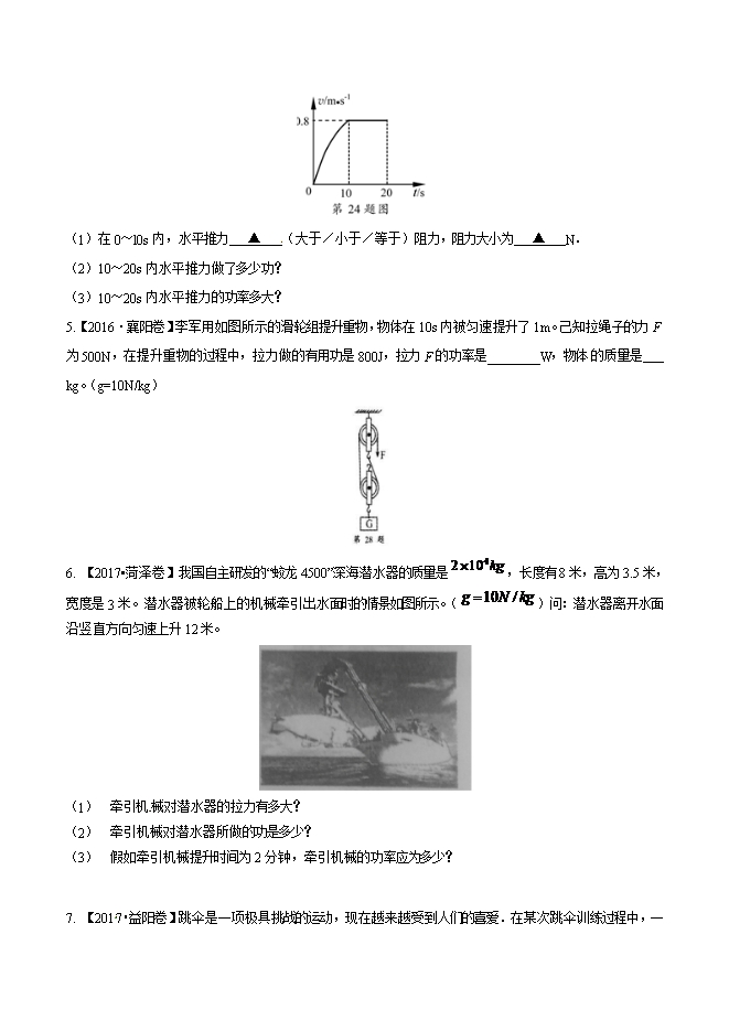 4.【2017•苏州卷】(6分)小华和妈妈去超市购物,她们将17kg物品放在小推车中推行,小推车在某段时间内速度v随时间t化的关系图像如图所示.已知小推车重130N,所受阻力是总重的0.15倍.(g取10N/kg)[