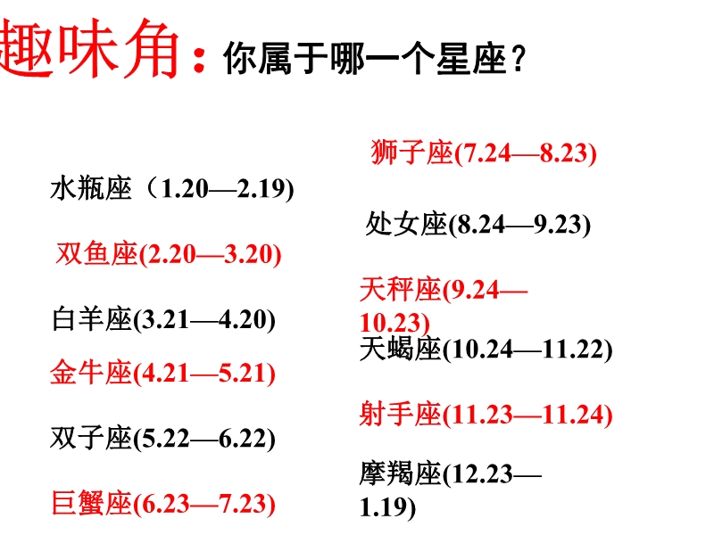 【内容简介】苏科版 八年级物理下册《7.4宇宙探秘》ppt课件共有45张幻灯片,从十二星座引入课题,分别介绍了人类对宇宙的认识历程和科学宇宙观的形成过程,着重介绍了太阳系八大行星。