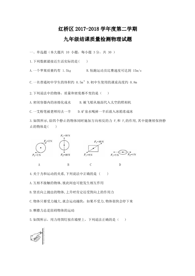 天津市红桥区2017-2018学年度第二学期九年级结课质量检测物理试题(PDF版)