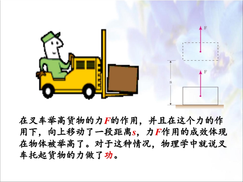 【内容简介】八年级物理人教版下册课件:《11.1节 功 》PPT课件,课件16张幻灯片,课件引导学生通过的实例总结了什么是做功,讨论了做功的必要条件,总结了功的计算公式和功的单位等