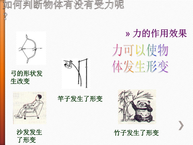 【内容简介】人教版八年级物理下册《7.1力》ppt课件共有18张幻灯片,通过大量生活实例得出力的概念,通过大量举例说明力的作用效果,练习力的示意图的画法。