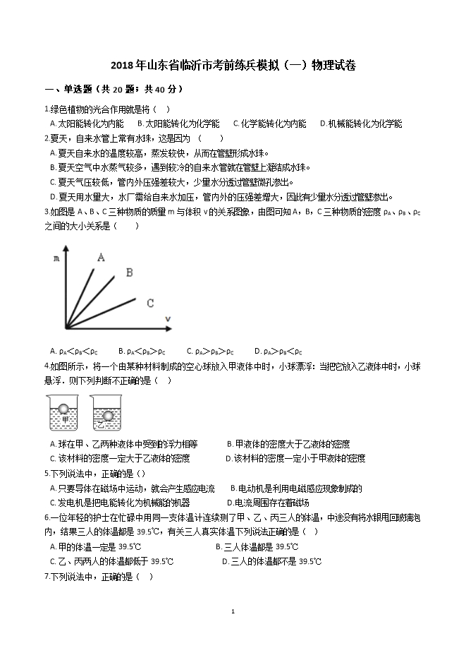 2018年山东省临沂市考前练兵模拟物理试卷及答案