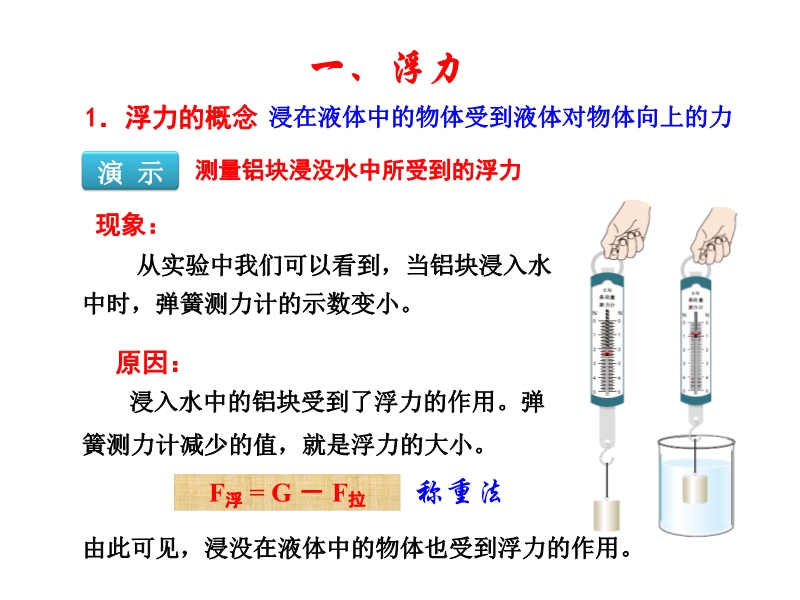 【内容简介】人教版:《10.1浮力》ppt课件(24张幻灯片),课件引导体验了浮力的存在,并引导学生利用弹簧测力计进行了测量,认识了浮力的方向,课件引导学生认识了浮力,并讨论了浮力产生的原因和浮力大小影响因素等。