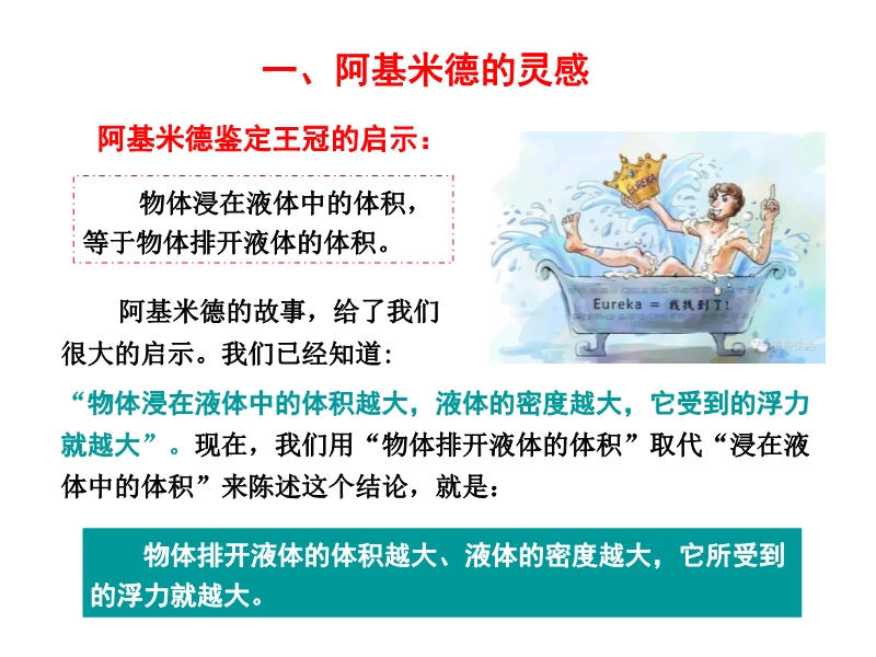 【内容简介】人教版:《10.2阿基米德原理》PPT课件,共有25张幻灯片。课件引导学生通过实验探究了浮力的大小与排开液体之间的关系,总结了阿基米德原理等