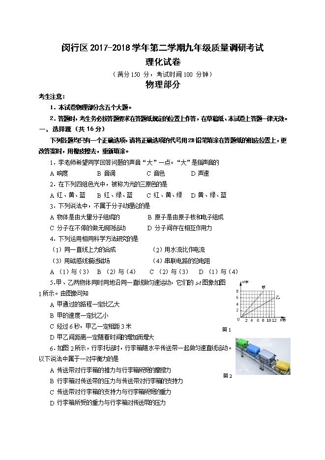 上海市闵行区2018届九年级下学期质量调研考试(二模)物理试题及答案