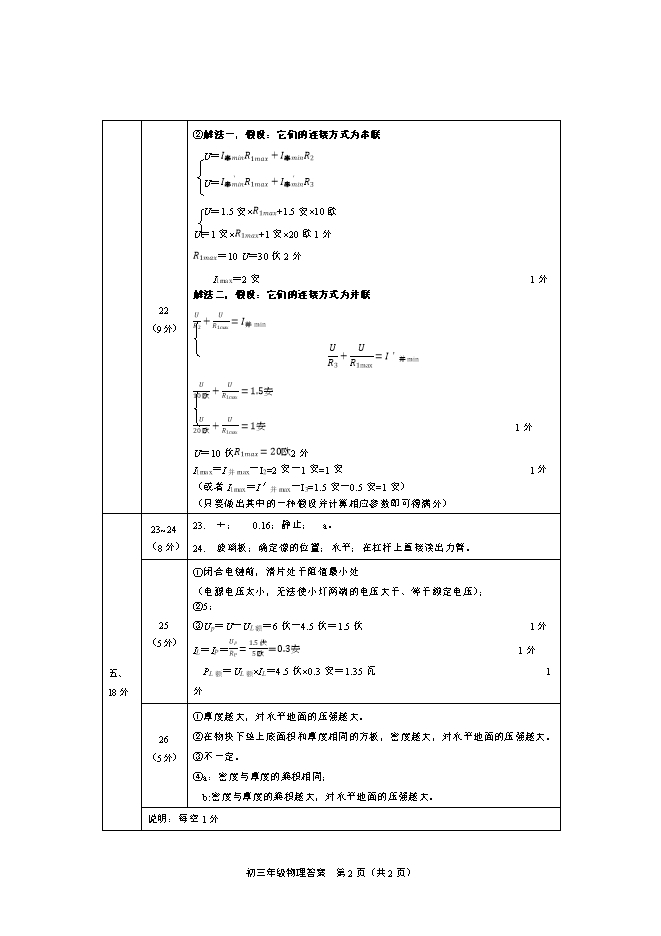 上海市长宁区2017学年第二学期初三教学质量检测试卷(2018.4长宁中考物理二模,Word版,含答案)