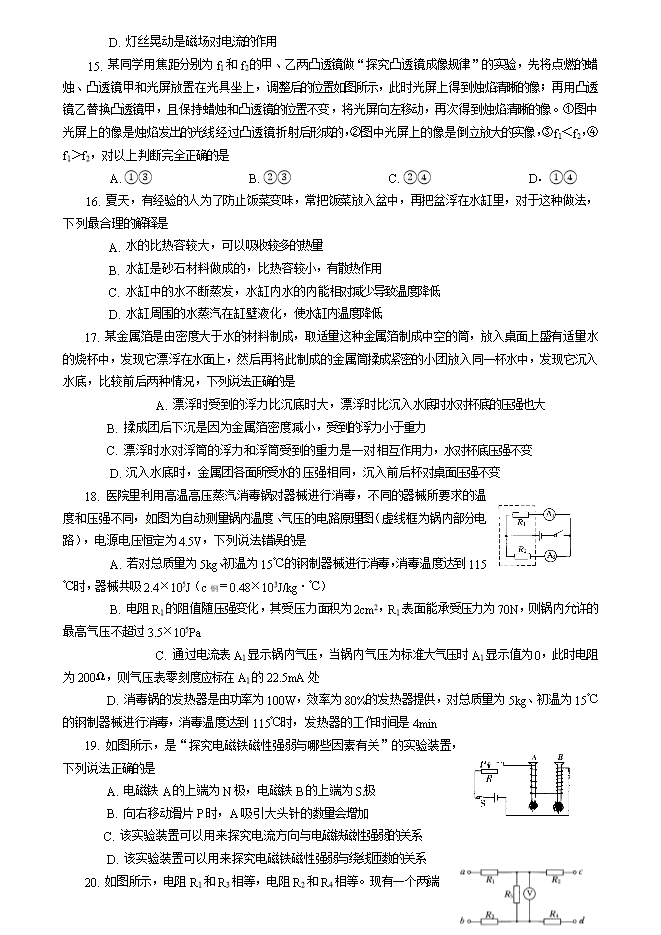 17. 某金属箔是由密度大于水的材料制成,取适量这种金属箔制成中空的筒,放入桌面上盛有适量水的烧杯中,发现它漂浮在水面上,然后再将此制成的金属筒揉成紧密的 小团放入同一杯水中,发现它沉入水底,比较前后两种情况,下列说法正确的是