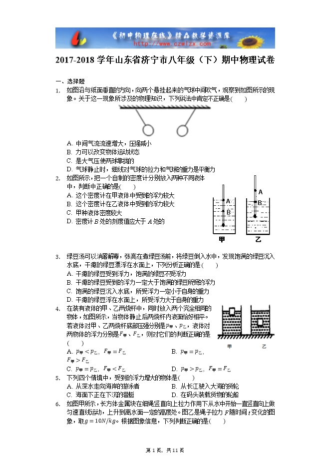 山东省济宁市2017-2018学年八年级(下)期中物理试卷(解析版)
