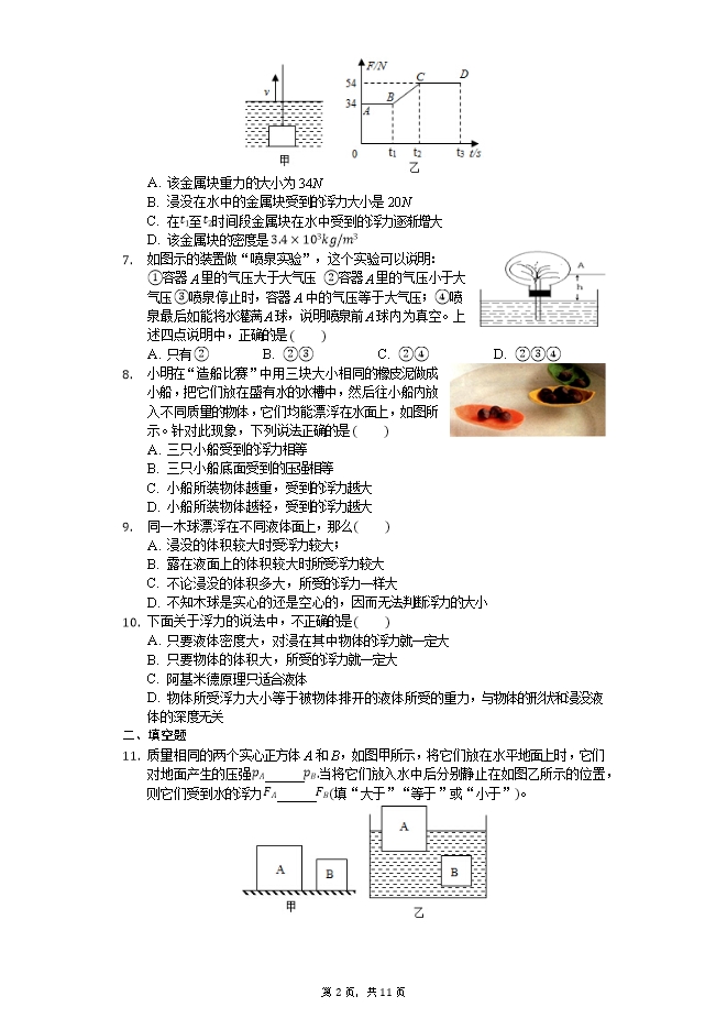 如图甲所示,长方体金属块在细绳竖直向上拉力作用下从水中开始一直竖直向上做匀速直线运动,上升到离水面一定的高度处。图乙是绳子拉力F随时间t变化的图象,取g=10N/kg。根据图象信息,下列判断正确的是( )