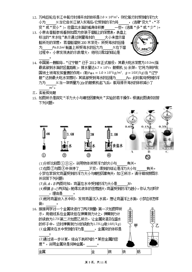 D. 该金属块的密度是3.4×〖10〗^3 kg/m^3