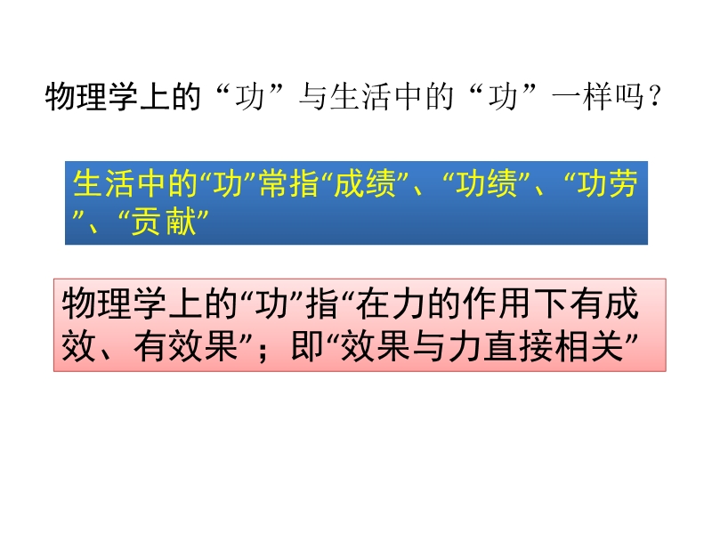 【内容简介】人教版《11.1功》ppt课件+flash,共有31张幻灯片。通过动画引导学生认识物理学中的“功”,并结合具体的实例讨论了做功和不做功,总结了做功的两个必要因素,并总结了做功的计算。