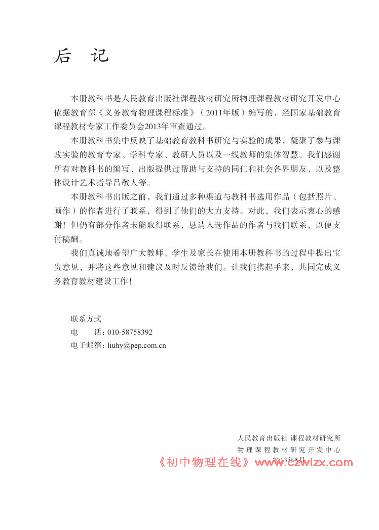 2013年新人教版物理九年级全一册《索引和后记》电子课本
