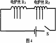 方案2:如图4所示,把两根不同的电炉丝(≠)串联起来接入电路,在、电炉丝用凡士林沾几根火柴,比较通电后哪根炉丝上的火柴先掉下来,通过分析讨论,串联电路中电流和通电时间相同,由公式分析同样也可以得出“电流的热效应与电阻有关”的结论。