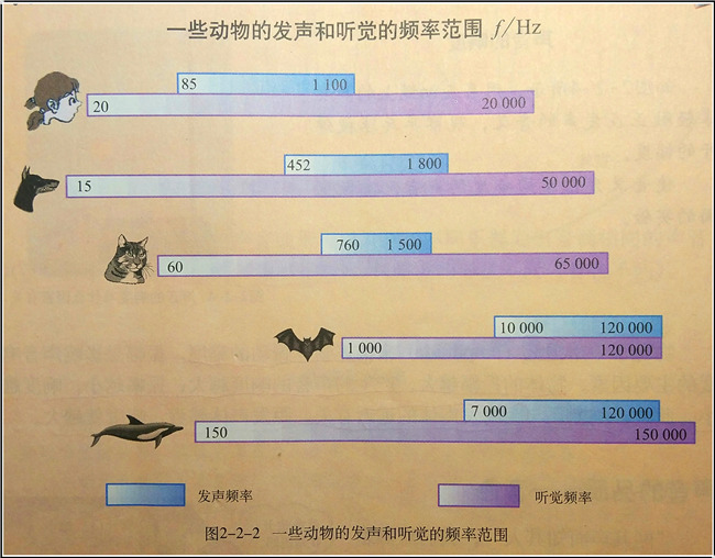 请看下面这张初中物理课本上的插图,可以看到不同动物的听觉频率范围都是不同的。