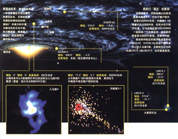 在我们的银河系内,其他一些天体也已呈递了表明自己黑洞身份的证书。例如,距地球8000光年的AO620-00和尚未测出距离的GX339-4,与麦哲伦云毗邻的两个天体LMCX-l和LMCX-3等。其他河外星系中同样发现了可能的黑洞,它们以每秒千万公里的速度吸进星际气体并喷出强大的射流。
